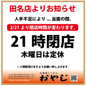 北海道らーめん おやじ をご利用くださいまして誠にありがとうございます。来る2月21日より田名店は人手不足のため、夜の閉店時間を当面の間短縮する事とさせていただきますので、ご理解いただけますようお願い申し上げます。 尚、 […]